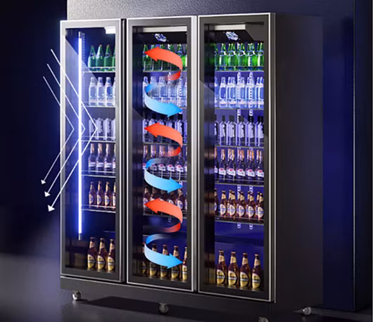 4. El refrigerador adopta un cuerpo de puerta de vidrio de tres capas doble hueco y una puerta de desempañamiento de calefacción eléctrica opcional, que elimina eficazmente la niebla de agua condensada en el vidrio y lo mantiene seco y transparente en todo momento. (Tipo de almacenamiento congelado)