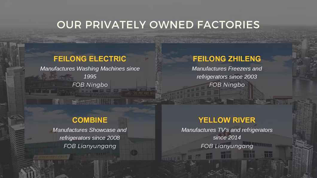 Feilong desde 1995, hasta ahora más de 25 años. Fabricamos lavadora, congelador, nevera y televisores más de 2M unidades cada año. Y exportamos a más de 150 países de todo el mundo.